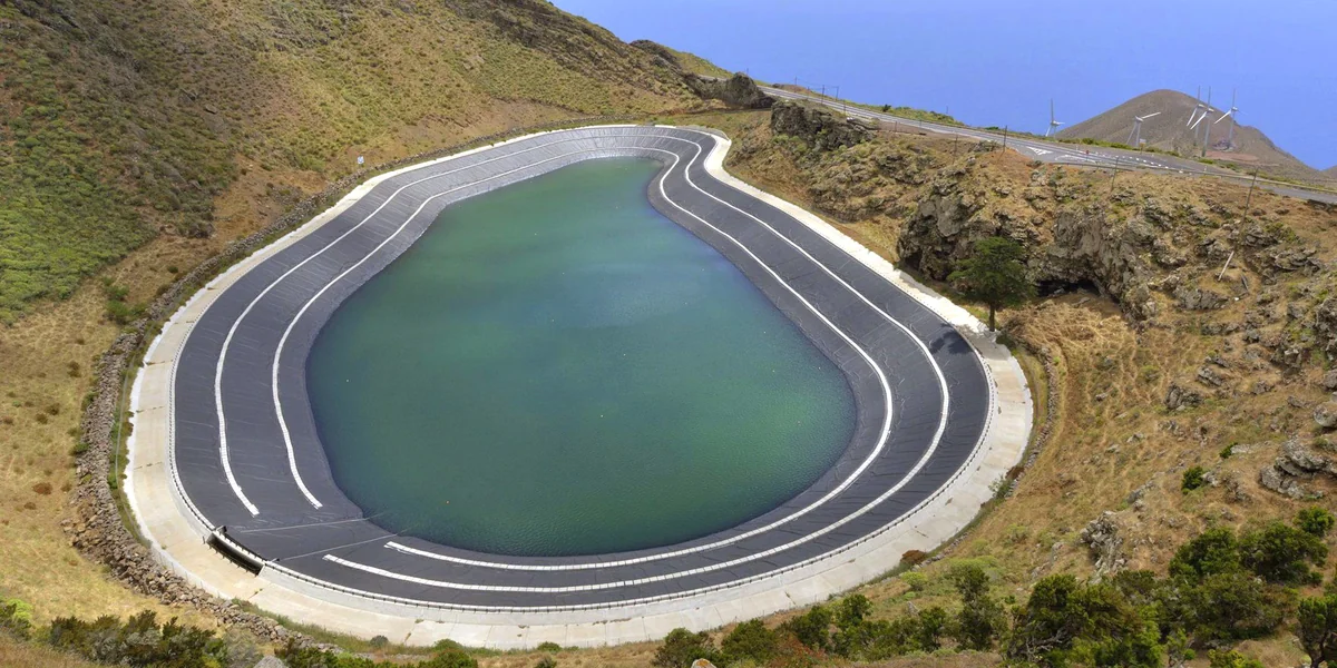 In diesem türkisblau schimmernden früheren Vulkankrater lassen sich bis zu 380.000 Kubikmeter Wasser speichern, die bei Windmangel abgelassen werden und dann Stromturbinen antreiben. Das System kann so vier Tage Flaute kompensieren und sich gleichzeitig in nur sechs Sekunden auf das schwankende Gleichgewicht zwischen Stromangebot und -nachfrage einstellen; spezielle Schwungräder überbrücken die Entkopplung.