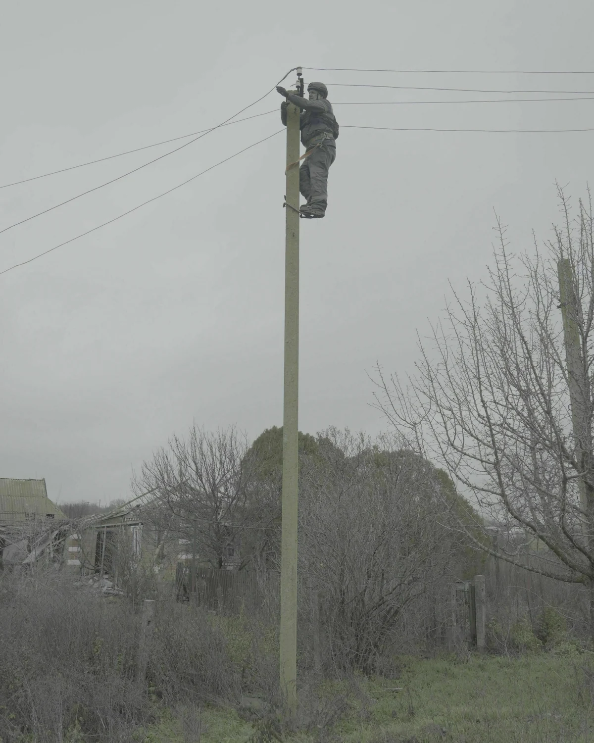 Vitalii Fisun will nach oben, hoch auf den Strommast neben dem Transformator, ein paar der Kabel dort sind intakt, andere halb zerfleddert, eins hängt zerfetzt herunter, liegt auf dem Feldweg. Vielleicht ist da das Problem für den Stromabfall? Er schnallt sich Steigeisen an die Schuhe und ein Klettergeschirr um den Körper. Während er sich Meter für Meter in die Höhe hievt, fällt der Schlamm in Fladen von seinen Schuhen.