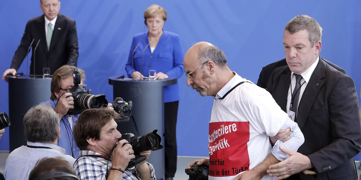 Recep Tayyip Erdoğan lächelt, als zwei BKA-Beamte in Zivil den Fotografen aus dem Saal zerren. Gegen Ende der Pressekonferenz hat sich der Mann ein T-Shirt übers Hemd gezogen, „Pressefreiheit für türkische Journalisten“, steht darauf, und so gekleidet schoss er in der ersten Reihe seine Fotos. Zu viel für die Sicherheitsleute: Erst forderten sie ihn auf, das Shirt wieder auszuziehen und sich nach hinten zu setzen. Weil er sich weigerte, führen sie ihn jetzt ab.