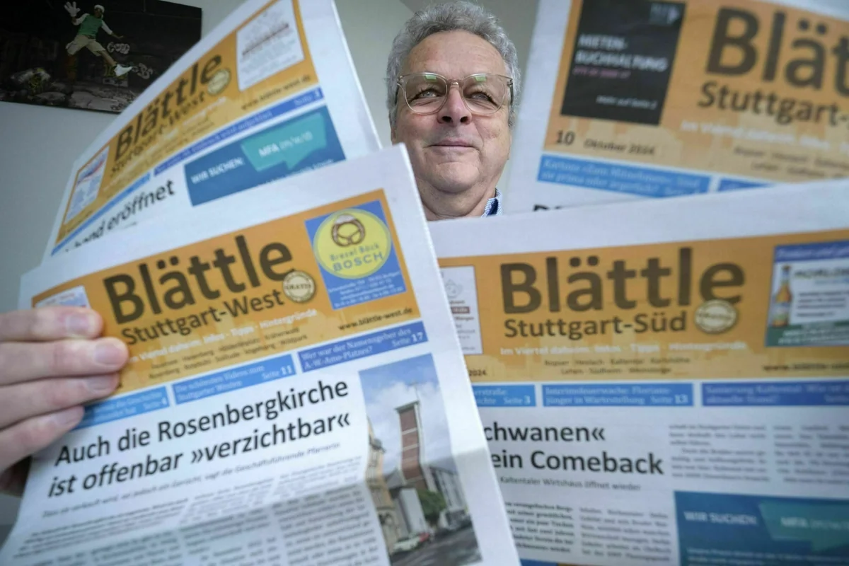 Jetzt folgt das nächste Abenteuer. Kontext expandiert. 2025 übernimmt der gemeinnützige Verlag zwei alteingesessene Schtuegerter Anzeigenblätter, die Stadtteilzeitungen Blättle-West und Blättle-Süd. Als Antwort auf die Lücken in der Stuttgarter Presse und als Signal, dass der Lokaljournalismus leben kann und will. Die bisherigen Blättle-Macher*innen Christel Werner und Titus Häussermann gelten in Stuttgart als „Nachrichtenhelden“. Aber auch die wollen irgendwann mal in den Ruhestand. Also geben sie ihre rund 100.000 Leser*innen in gute Hände ab.