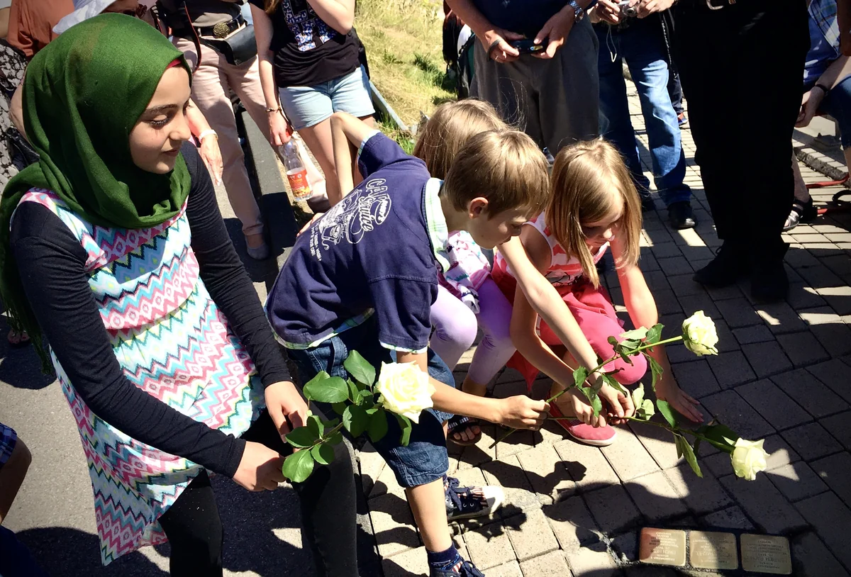 In ihrer Ansprache findet die örtliche Volkshochschul-Direktorin passende Worte, die in solchen Augenblicken die Sprachlosigkeit überwinden sollen, die seit Jahrzehnten die konsequente Aufarbeitung der Nazi-Zeit behindert: „Wir alle wissen um unser historisches Erbe“, sagt sie. „Daran gibt es nichts zu deuteln und nichts zu verbergen und nichts zu verdrängen. Und es gibt nichts zu vergessen.“ Besonders nicht, wer die Opfer waren: „Nachbarn in unserer Stadt, Mitmenschen, Mitbürger. Eine, einer von uns. Mit einem Namen und einem Heim vielleicht gleich nebenan.“