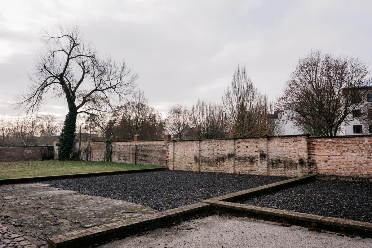 Jetzt, wo wir wieder nach draußen gehen, an den Ort des Tötens, wird es noch stiller. Keiner muss, darauf wird ausdrücklich hingewiesen, aber alle wollen sich das zumuten. Die Gruppe geht über eine asphaltierte Fläche (auf der Autos parken) auf Stelen zu, auf denen Bilder und Lebensdaten von getöteten Menschen aus verschiedenen Opfergruppen zu sehen sind. Dahinter sind die Grundmauern eines nicht mehr existierenden Gebäudes zu erkennen, auf dem Boden liegt Schotter: Hier stand die Scheune, auf alten Fotos ist sie zu sehen. An der Grundstücksgrenze steht eine Ziegelmauer mit seltsamen großen schwarzen Flecken.