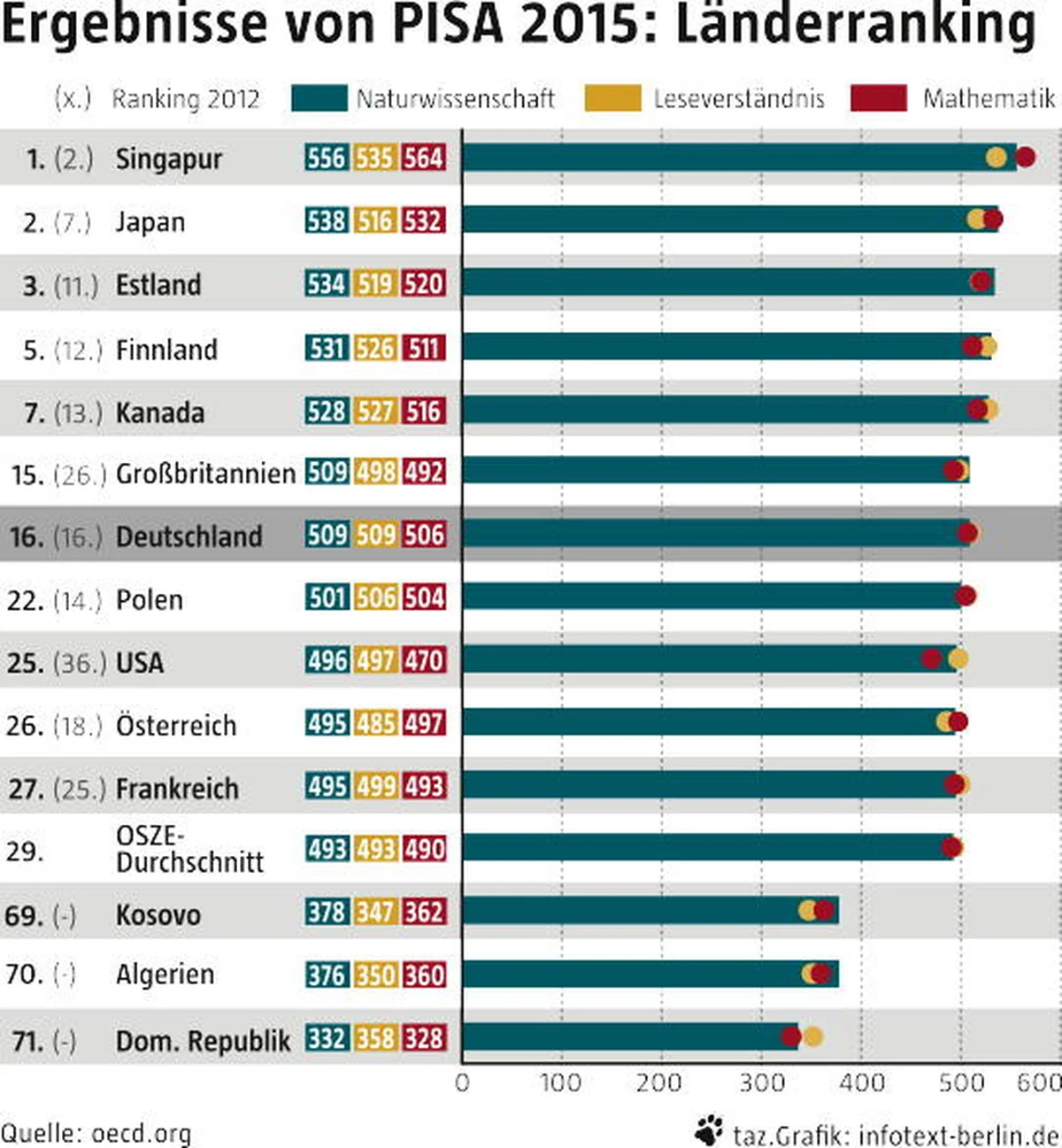 Demnach befinden sich deutsche SchülerInnen in allen drei geprüften Bereichen über dem OECD-Durchschnitt. So erzielten die geprüften 15-Jährigen beim diesjährigen Schwerpunkt Naturwissenschaften im Schnitt 509 Punkte (OECD: 493), bei der Lesekompetenz 509 Punkte (OECD: 493) sowie 506 Punkte bei Mathematikaufgaben (OECD: 490). Damit liegt Deutschland im Leistungsumfeld von Ländern wie Korea, Slowenien, Niederlande und Schweiz. Ganz vorne sind Singapur, Japan und Estland, als bestes europäisches Land.
