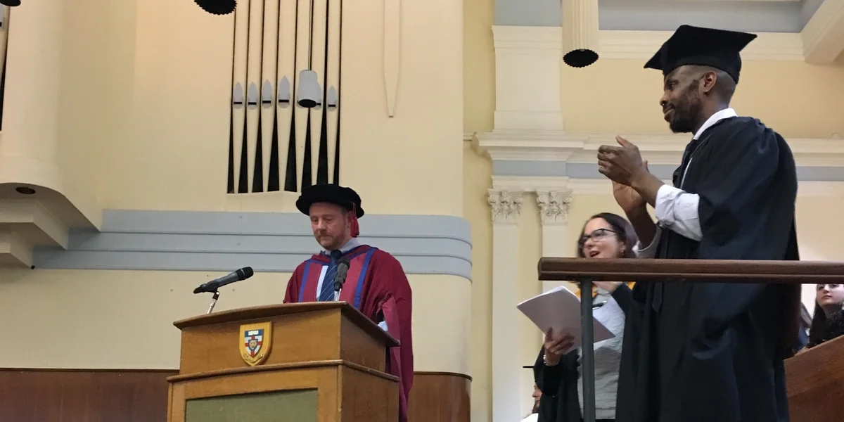 Patrick Loughrey, der Chef von Goldsmiths, sagte in seiner Eröffnungsrede für die 300 Absolvent*innen verschiedener Fachrichtungen, allesamt hätten sie die Hochschule bereichert und Spuren hinterlassen. Alles klang wie Schmuckrhetorik, aber es schien, als würde auch Khalil West, der erste sichtbare Erfolgsrepräsentant der Queer Historians in London, ein wenig lächeln: Behände, mit wehendem Textil, schreitet er die Bühne des Saales ab, von Beifall umbrandet.