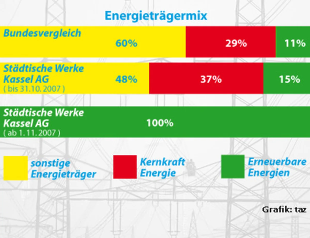 In Sachen Anbieterwechsel setzen Hessens Kommunen inzwischen Maßstäbe. Am Donnerstag hatte die Stadt Wolfhagen bei Kassel mitgeteilt, dass ihre Kunden ab 2008 ausschließlich mit Strom aus österreichischen Kraftwerken beliefert werden sollen. In Kassel werden allerdings nur die Privatkunden mit Strom aus regenerativen Energien beliefert, sie machen 50 Prozent des Absatzes aus. Gewerbekunden sollen weiter aus den eigenen Kraftwerken der Stadtwerke beliefert werden.