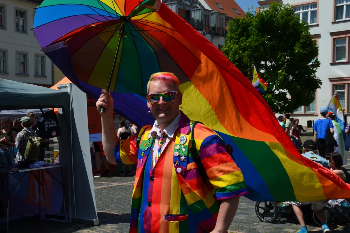 Auf der Bühne bahnt sich währenddessen eine Diskussionsrunde an: Akteure aus der Zivilgesellschaft und Politiker:innen aus dem Landtag sprechen über queere Sichtbarkeit und wie sich die Gesellschaft wandelt. Vor der Bühne hört ein Mann zu, der sich Olaf Wunderbar nennt. Um 4 Uhr am Morgen sei er an der Ostsee losgefahren, um rechtzeitig beim ersten CSD in Merseburg zu sein, sagt er. Seine Schuhe, seine Hose, sein Sakko und sein Schirm, alles erinnert an einen Regenbogen.