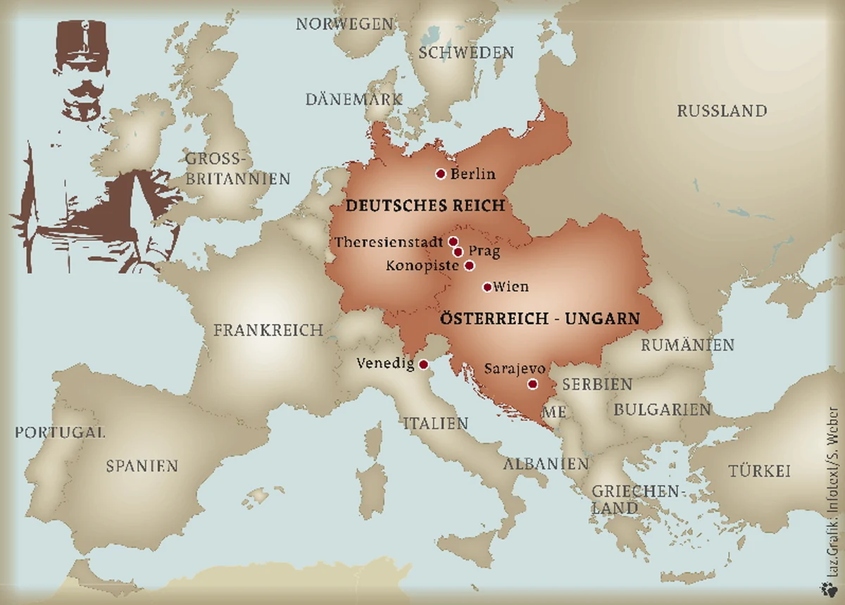 Die Ausgangslage: Der 28. Juni 1914 war ein Sonntag. Der österreichische Thronfolger Erzherzog Franz Ferdinand, 51, war zu Manövern nach Bosnien gereist, das 1908 von Österreich-Ungarn annektiert worden war. Gegen diese Besetzung machte die großserbische Bewegung „Mlada Bosna" (Junges Bosnien) Front. Sie wollte einen Staat auf dem Balkan unter serbischer Führung.