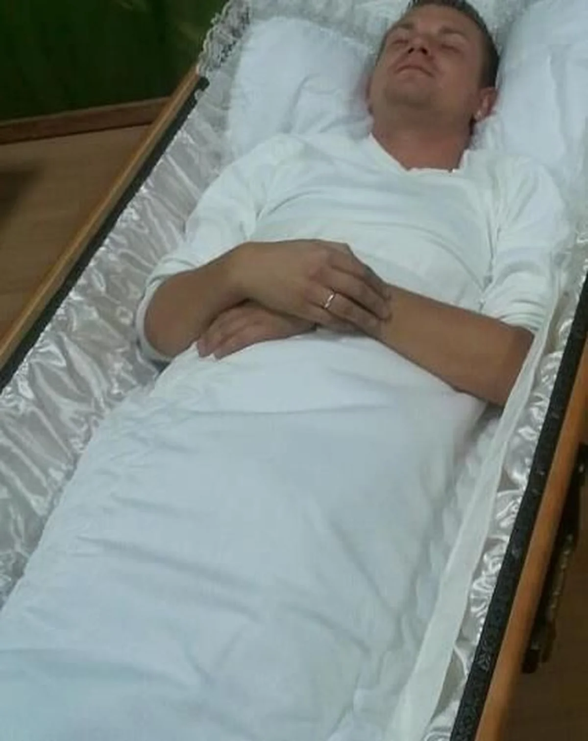 Auf einem der Fotos liegst du in einem Sarg. Wie hast du das denn hinbekommen? Ich meine: Du lebst ja noch.
