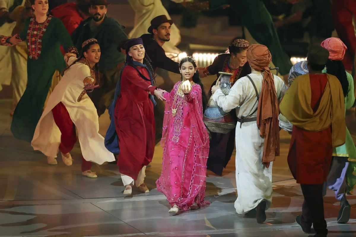 Im nächsten Gang hängen große gedruckte Fotos von Familien, „die in den Emiraten ihre Träume verwirklicht haben“, erklärt die Presseverantwortliche. Die Fotos zeigen Mann, Frau und Kinder im Wissenschaftslabor oder im Garten mit Vögeln. Auf einem Bild lacht die erste Feuerwehrfrau der VAE. Zum Abschluss läuft ein Film im integrierten Kinosaal. Darin zeichnet ein Stift Kamele, fliegende Falken und eine aufgehende Sonne.