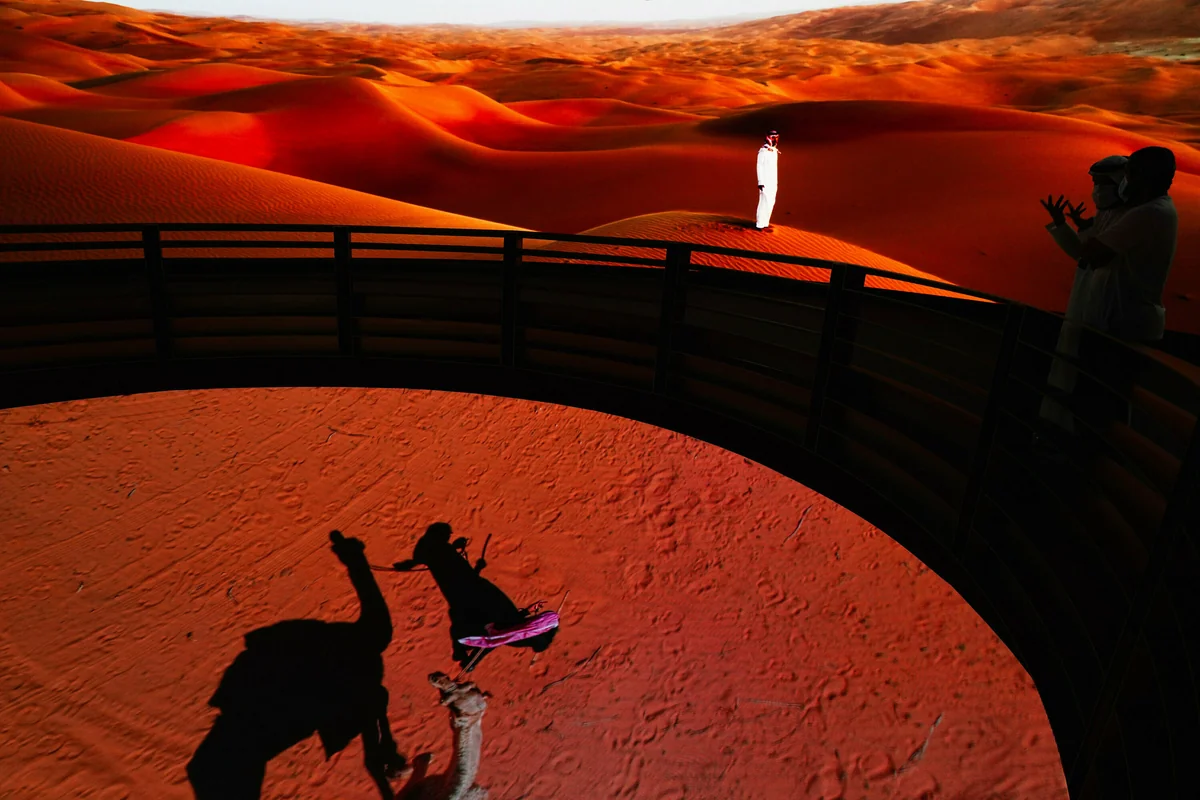 Vor allem arabischsprachige Fotograf*innen und Kamerateams arbeiten hier. Die staatliche Zeitung Al-Ittihad hat Personal für den kompletten Zeitraum auf dem Gelände stationiert. Sie sollen über die Shows, Paraden und hohen Besuche berichten. In Elektrobuggies, wie sie sonst auf Golfplätzen zu sehen sind, wird das Medienpersonal zu seinen Terminen gefahren.