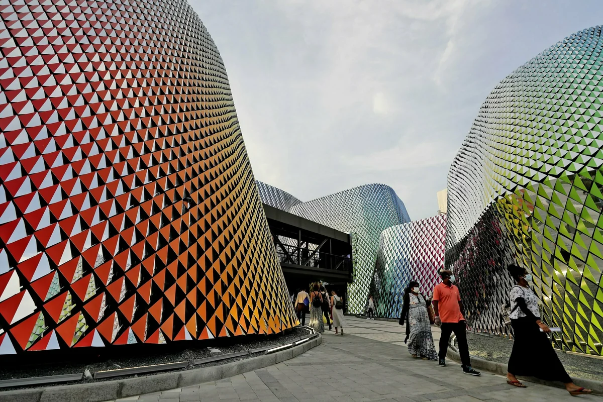 Es hakt noch an vielen Stellen. Im Pavillon Marokkos werden noch Ausstellungsräume fertiggestellt, Israels Pavillon eröffnete erst am Ende der ersten Woche. Sogenannte Trycicles – Elektrofahrräder mit drei Rädern, für die extra eine 330 Meter lange Rennstrecke gebaut wurde – sind noch nicht da, es gäbe Probleme mit dem Sponsoren, heißt es. Das „epochale Banquett“, ein Dinner, das Gerichte aus dem imaginären Jahr 3020 serviert, ist in der ersten Woche nur Freund*innen der Expo vergönnt. Und von einer Architekturtour, die auf der offiziellen Webseite angekündigt ist, weiß das Presseteam nichts.