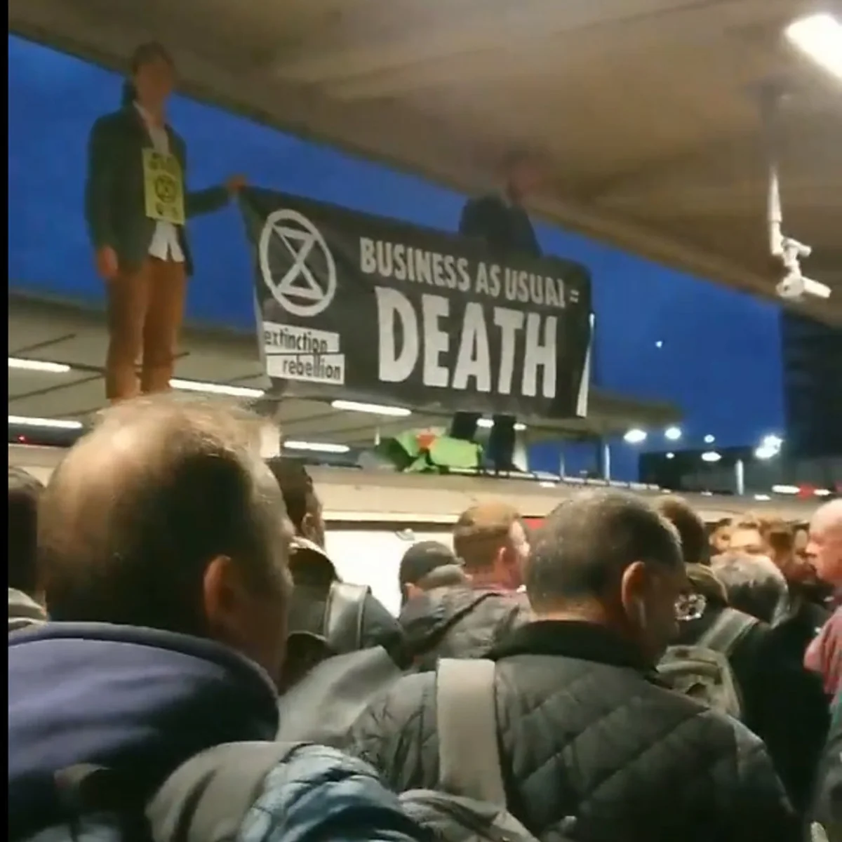 Zwei Männer mit Jacket stehen in der Rushhour auf einem Dach eines U-Bahn-Wagens an einem Umsteigebahnhof im Osten Londons. Die Hauptstädter wollen eigentlich gerade zur Arbeit. Die U-Bahn ist blockiert, die Männer halten ein schwarzes Banner mit riesiger weißer Aufschrift in die Höhe. „Weiter wie immer heißt Tod“ („Business as usual equals death“) steht darauf, dazu die Worte Extinction Rebellion (XR) mit dem Sanduhr-Symbol der Bewegung.