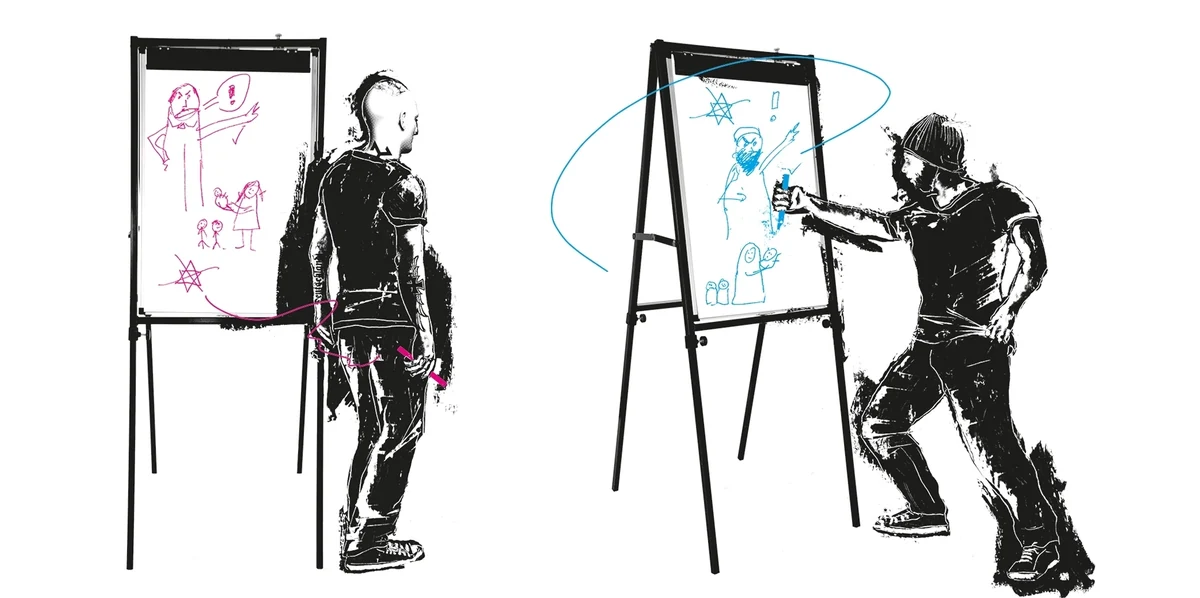 Ein Extremismus spiegelt sich perfekt am anderen. Während der Stunden des Workshops haben Alex und Khaled verbissen dagegen gekämpft, einander ähnlich zu sein. Doch die Parallelen waren unübersehbar. Trotzdem bleibt es ihnen bis zum Schluss wichtig zu betonen, dass sie „total unterschiedlich“ sind. Abgrenzung ist ein Muss, Überschneidungen dürfen nur Zufall sein.
