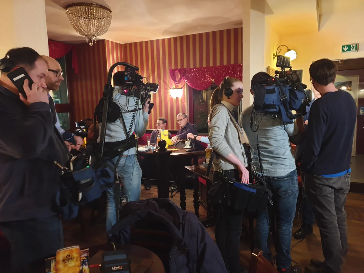 Vor der Bar steht ein Polizeiwagen, die FDP muss beschützt werden, und das, obwohl sie in Ilmenau eine eher marginale Rolle spielt: Es gibt 10 Mitglieder im Ortsverband und etwa 40 im Kreisverband. Drinnen sitzen mehrere Mitglieder an einem länglichen Tisch, auf dem Biere und kleine FDP-Aufsteller aus Pappe stehen. Um den Tisch drängen sich zwei Kamerateams, eines von RTL und eines vom MDR. Sie leuchten die Szene hell aus.
