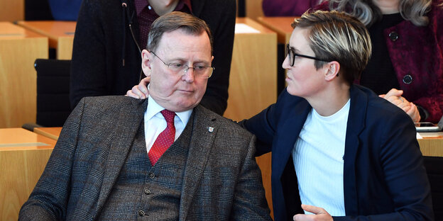 Landeschefin Susanne Hennig-Wellsow tröstet den abgewählten Ministerpräsident Bodo Ramelow Foto: dpa
