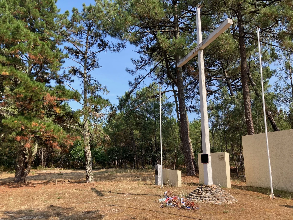 Im Centre Hélio-Marin erfährt man davon nichts. Aber ein paar Kilometer landeinwärts findet sich eine Gedenkstätte, an der die meisten Menschen auf dem Weg zur Küste vorbeirauschen. Sie befindet sich an der Stelle, an der vor 80 Jahren die letzte Schlacht des Krieges an diesem Ort begann. Unter einem großen Kreuz erinnern ein paar Kränze aus Plastik an dieses Ereignis. Die besiegten Wehrmachtssoldaten wurden in einem zuvor von den Nazis errichteten Lager vor Ort interniert. Sie wurden zur Räumung der Minen verpflichtet.