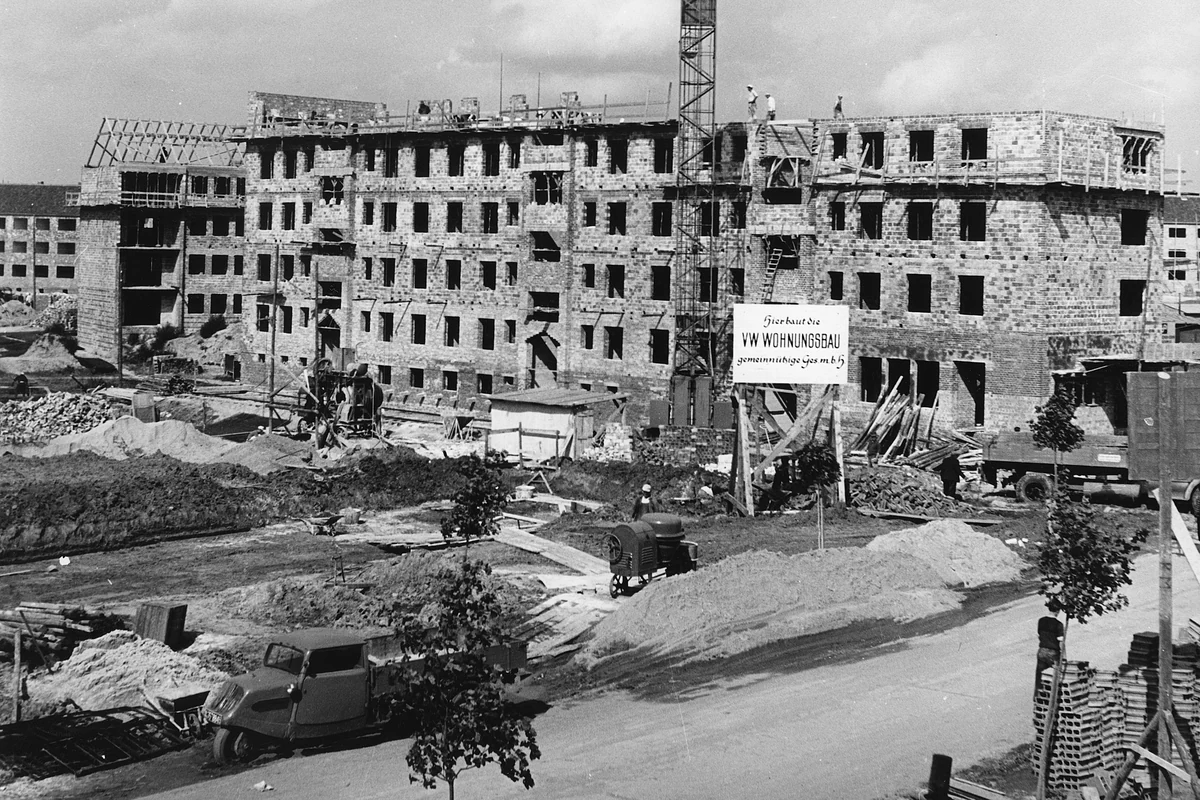 Die Stadt- und Konzerngeschichte sind eng verwoben. Das VW-Werk entstand im Mai 1938 unter den Nazis, fast zeitgleich wurde die dazugehörige „Stadt des KdF-Wagens bei Fallersleben“ gegründet. Im Zweiten Weltkrieg wurden im Werk vor allem Rüstungsgüter durch die Ausbeutung von Zwangsarbeiter*innen produziert. Die Alliierten benannten die Stadt nach Kriegsende in Wolfsburg um. Zu diesem Zeitpunkt besteht Wolfsburg vor allem aus Baracken, Lagern und nur wenigen Wohnhäusern.