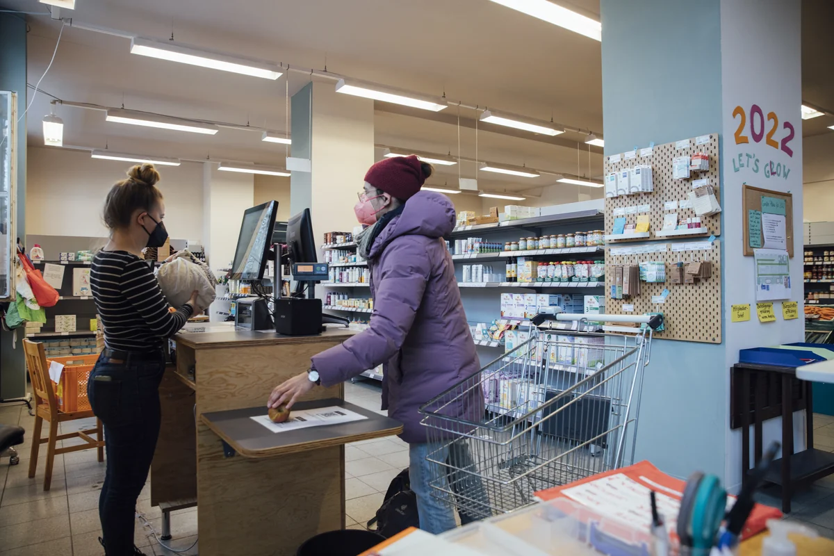 Zwei Frauen stehen hinter der Kasse und eine davor. „Ist heute mein erstes Mal“, lächelt die, die auf dem Bildschirm herumtippt. Sie weiß nicht, wie sie 236 Gramm Tara für das mitgebrachte Glas abziehen soll. Auch ihre Kollegin ist ratlos. Die Kundin wechselt die Seite und zeigt, wie es geht: Alltag in der SuperCoop im Wedding. Alle hier sind gleichermaßen Mitarbeiter*innen, Kund*innen und Miteigentümer*innen.
