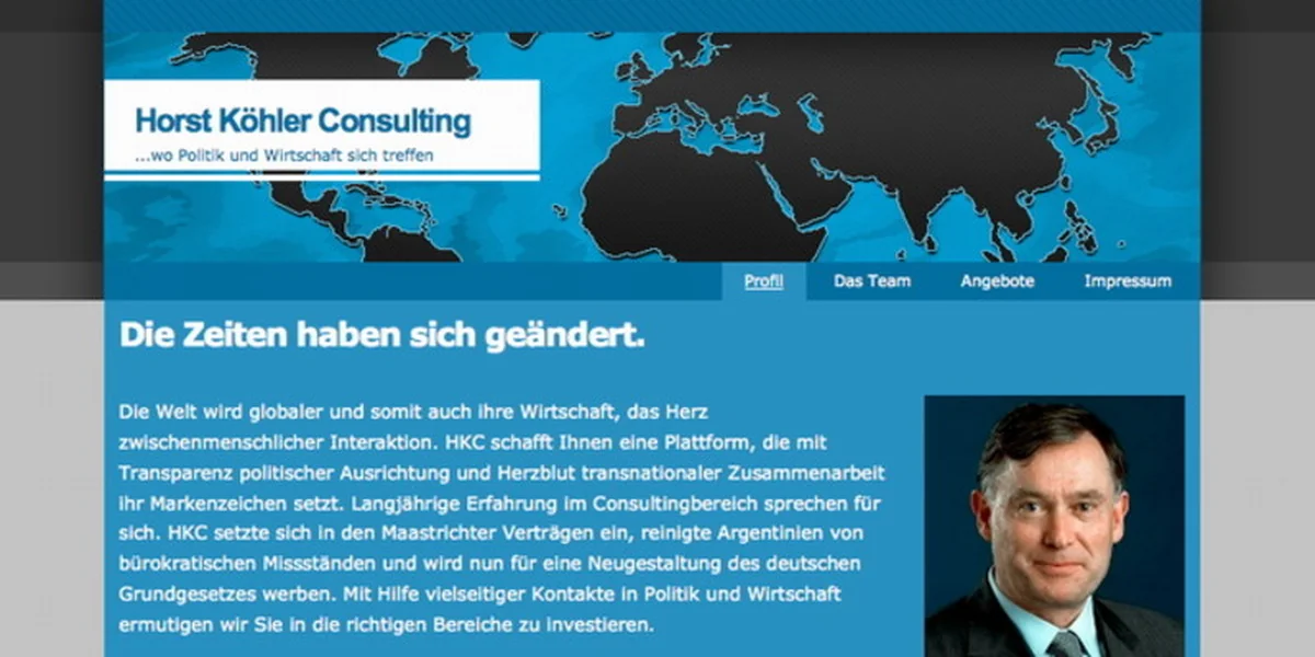 Auf der Seite horst-koehler-consulting.de bot vermeintlich der Bundespräsident a.D. Horst Köhler Unternehmen Beratung auf Basis seiner militär- und außenhandelspolitischen Kompetenzen an. Zu seinem Kompetenzteam sollten unter anderem Ex-Bundeskanzler Gerhard Schröder, verantwortlich für „Putin Relations“, Ex-Außenminister Joschka Fischer, verantwortlich für „Green Warfare“, sowie Ex-Bundeskanzler Kohl, als „Head of Secret Accountance“ zählen – die Seite mussten für jeden klar als Satire zu erkennen sein.