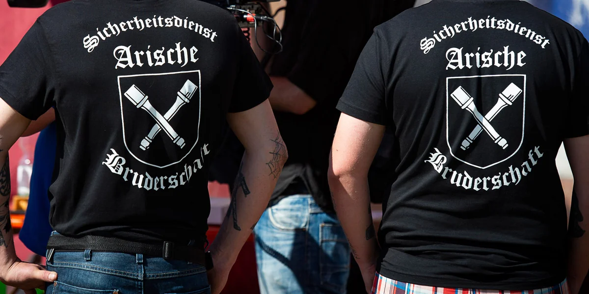 Der „Sicherheitsdienst Arische Bruderschaft“ beim Festival „Schild und Schwert“ Foto: dpa