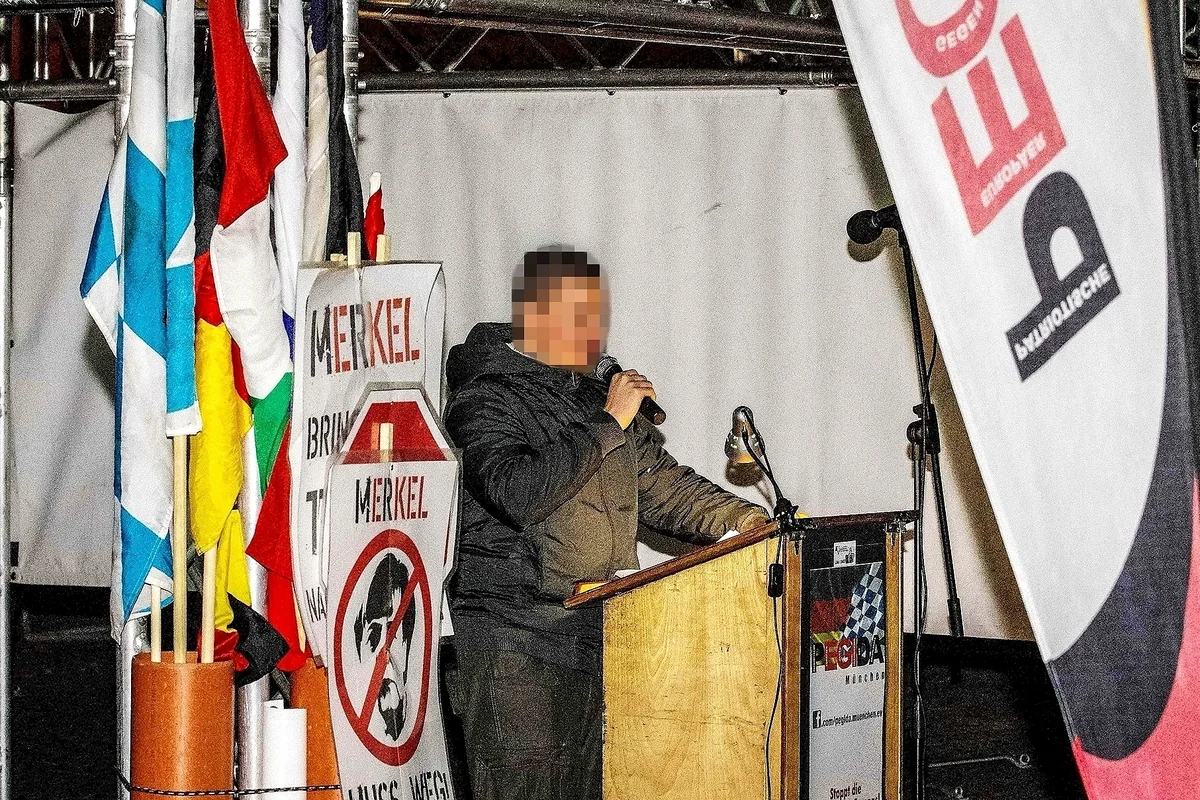 Laut einem Bericht des Bayerischen Rundfunks hat er dort die Menge auf einen „Systemwechsel“ eingeschworen und Journalist:innen damit gedroht, dass sie „wenn die Zeit gekommen ist, in Vergeltung vom Volk auch wieder auf den Marktplatz gestellt“ werden. Auf seiner Brust soll er ein Tattoo der neonazistischen Terrororganisation Combat 18 tragen.
