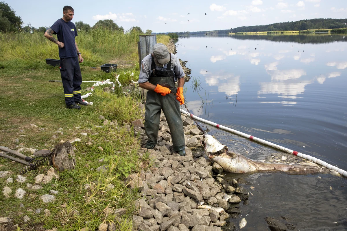 Am gegenüberliegenden Ufer patrouilliert die polnische Feuerwehr in einem kleinen Motorboot. Sie fahren auf und ab, entlang der roten Ölbarriere im Wasser, in die die Fischkadaver anschwemmen. Mit einem kleinen Schwimmbagger heben sie die toten Tiere aus dem Fluss. Im Vergleich zu Fischer Zahns Schwimmbadleine sieht das, was dort passiert, etwas professioneller aus.