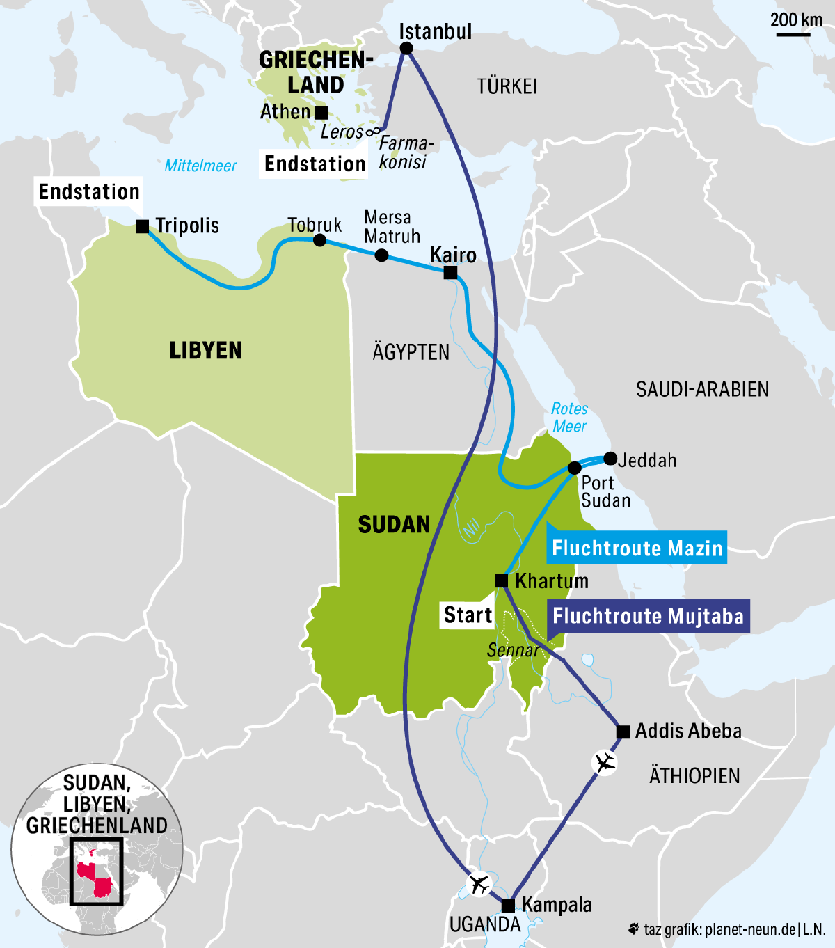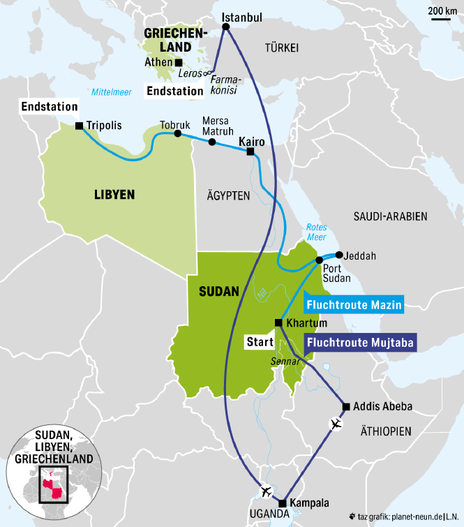 Mazin hatte ein Visum für Saudi-Arabien, Mujtabas Pass lag in der deutschen Botschaft in Khartum. Dann brach Krieg aus. Geschichte zweier Fluchten.