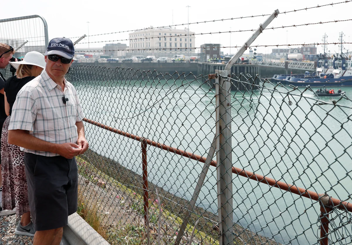 Rechtzeitig zur Morgendämmerung haben sich zwei dickbäuchige Männer hinter den Schutzzaun auf dem Felsen mit direkter Sicht auf das Hafenbecken postiert. Der eine trägt eine grüne Armeetarnhose und ein T-Shirt, der andere einen Trainingsanzug. Mit Fernrohren und Teleskopkameras halten sie nach Bewegung auf dem Wasser Ausschau, geleitet von Apps auf den Smartphones, die alle Schiffsbewegungen im Ärmelkanal anzeigen.