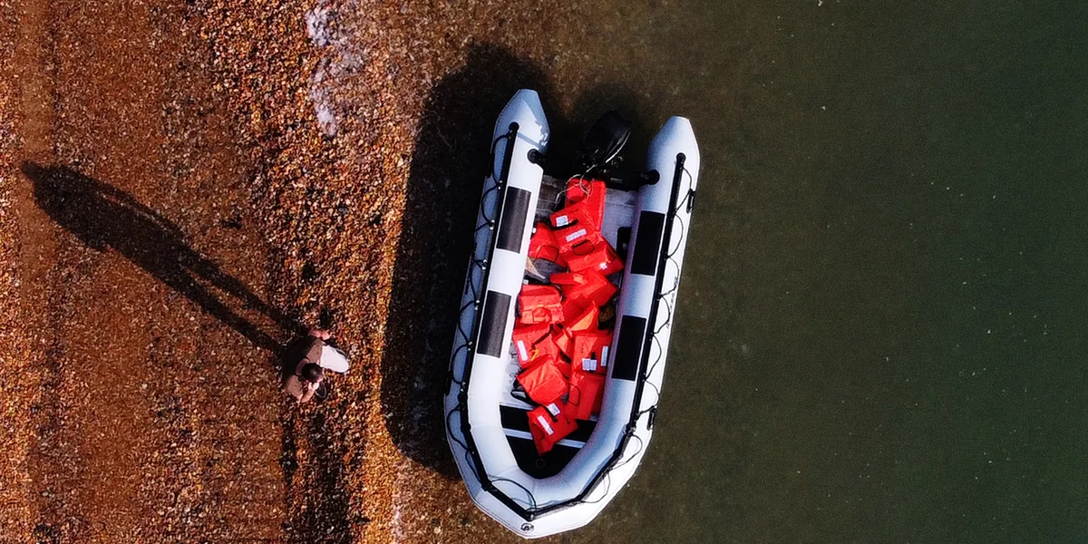 Ein Grenzschützer, wegen Covid-19 gekleidet in einen weißen Seuchenschutzanzug, wies mit hochgekrempelten Ärmeln den Weg aufs Land: über zwei angedockte größere Boote und einen Landesteg. Weiter ging es zur mobilen Aufnahmestation: ein paar Container und Zelte auf einem Lkw-Parkplatz. Ein weißer Bus stand neben einem Krankenwagen, für alle Fälle.