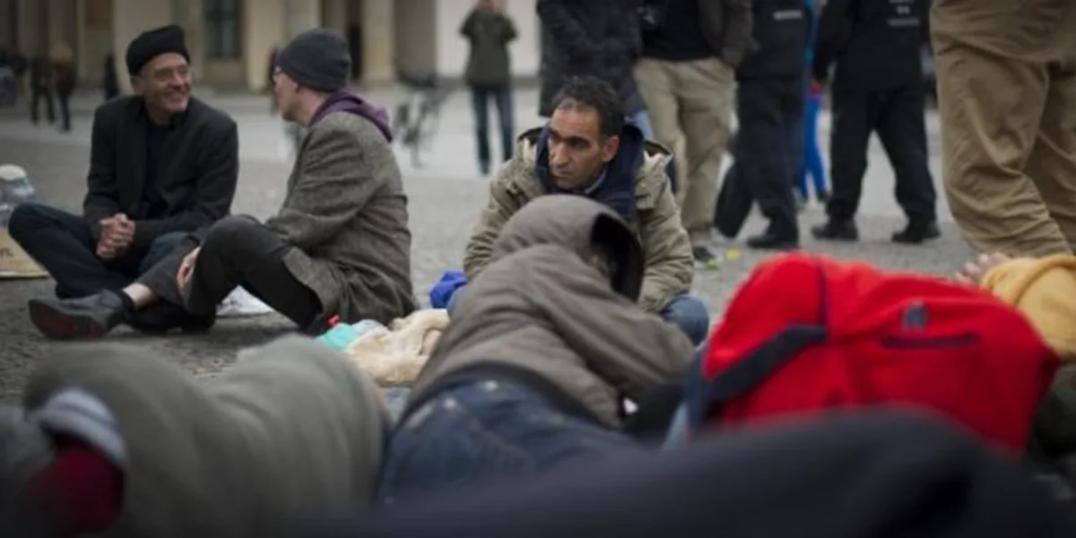 In dicken Jacken gehüllt, unter ein paar Regenschirmen sitzen die 20 Flüchtlinge am Donnerstag vor dem Brandenburger Tor. Einige versuchen zu schlafen, um sie herum liegen Transparente. Im Hintergrund posieren Schausteller in US- und Sowjetuniformen für Fotos.