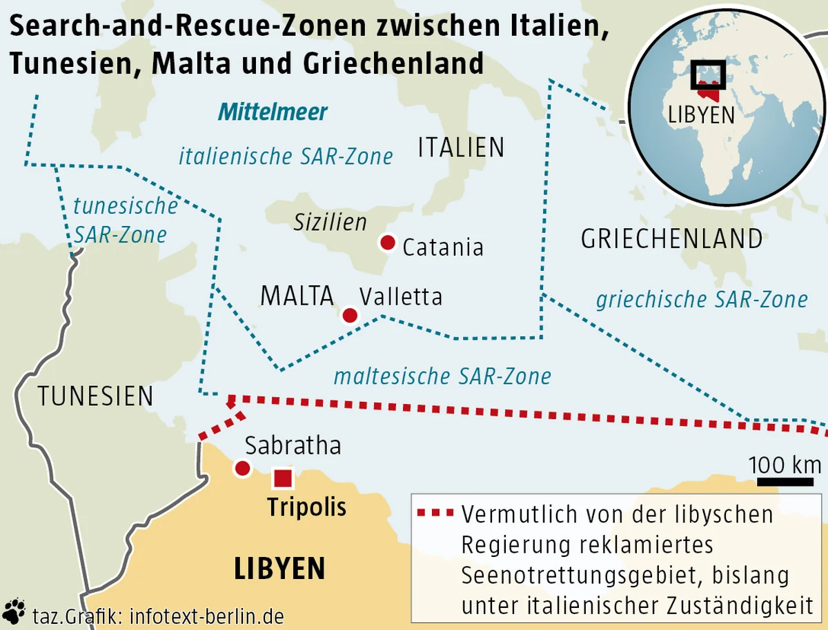 Nach Informationen der taz ging vor einigen Tagen bei der Internationalen Seeschifffahrts-Organisation IMO in London ein Brief der libyschen Regierung ein. Darin zeigt diese an, ab jetzt für Notfälle in der südlichen Hälfte des Seegebiets zwischen Libyen und Italien zuständig zu sein. So ist es international üblich. Bislang war Libyen dazu allerdings nicht imstande, weshalb Italien die Hilfseinsätze bis an die Grenze der 12-Meilen-Zone vor Libyen koordinierte. Damit soll nun Schluss sein. „Kein fremdes Schiff hat das Recht, unerlaubt in dieses Gebiet einzudringen“, sagte Abdelhakim Bouhaliya, Kommandeur der Küstenwache in Tripolis. Genau das ist höchst strittig: Die Verantwortlichkeit für die Rettungen verleiht nicht das Recht, Schiffe auf hoher See zu vertreiben oder gar aufzubringen.