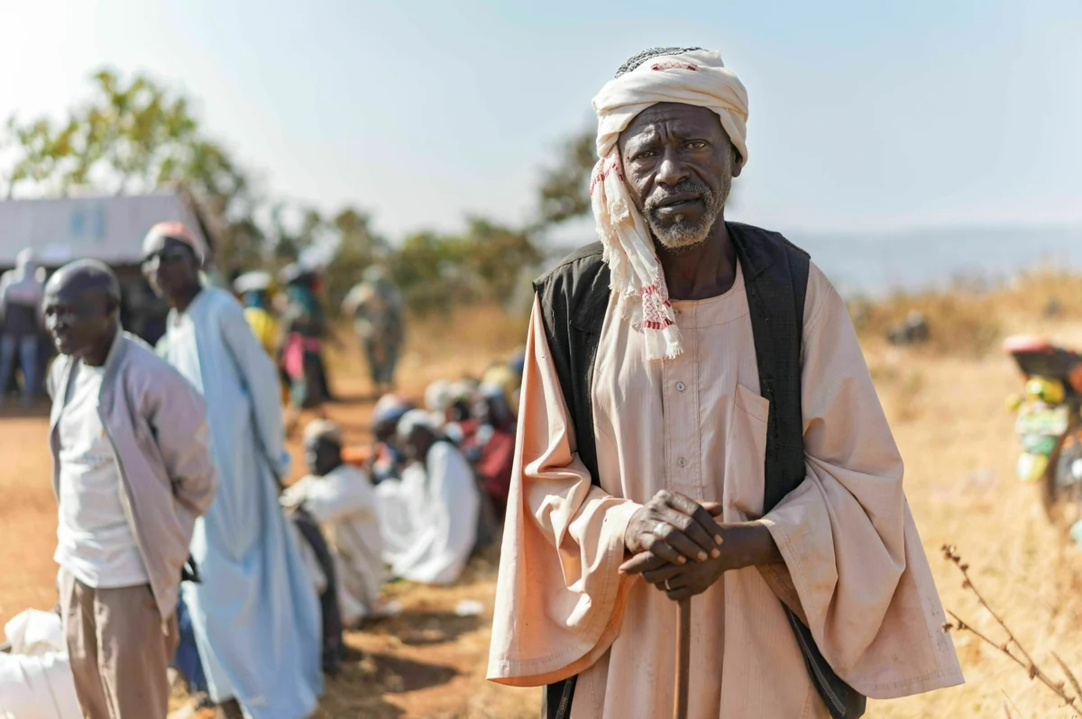 In der Warteschlange vor der Lebensmittelausgabe des Ura-Flüchtlingslagers hockt ein älterer Herr in der prallen Sonne auf dem Boden. „Manchmal warte ich drei oder vier Tage“, sagt er. Vor ihm liegt sein Gehstock. Er trägt eine lachsfarbene Jalabiya, das traditionelle lange Gewand mit weiten Ärmeln, und einen weißen Turban. Aus seiner Brusttasche holt er eine kleine Plastikkarte heraus – darauf die Logos des UNHCR und UN-Welternährungsprogramms WFP. Stanzlöcher in Herzform dokumentieren, wie viele Rationen er bereits erhalten hat. „Es gibt keine Seife, keinen Zucker, keine Milch“, klagt er. Die UNHCR-Mitarbeiterinnen und -Mitarbeiter verteilen lediglich Hirse, Bohnen, Öl, Salz und ein Mais-Soja-Pulver, aus dem ein nahrhafter Brei hergestellt werden kann. Außerdem händigen sie jeder Person monatlich Bargeld im Wert von 2,30 Euro aus.