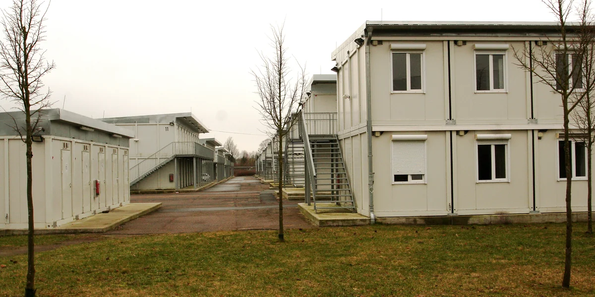 14 Quadratmeter Deutschland: Zwei Doppelstockbetten stehen in dem engen Raum, ein Tisch mit zwei Stühlen, ein Schrank in der Ecke. Der Blick aus dem Fenster zeigt Reihen von Wohncontainern und die ziegelroten Gebäude einer ehemaligen Kaserne in Rendsburg.