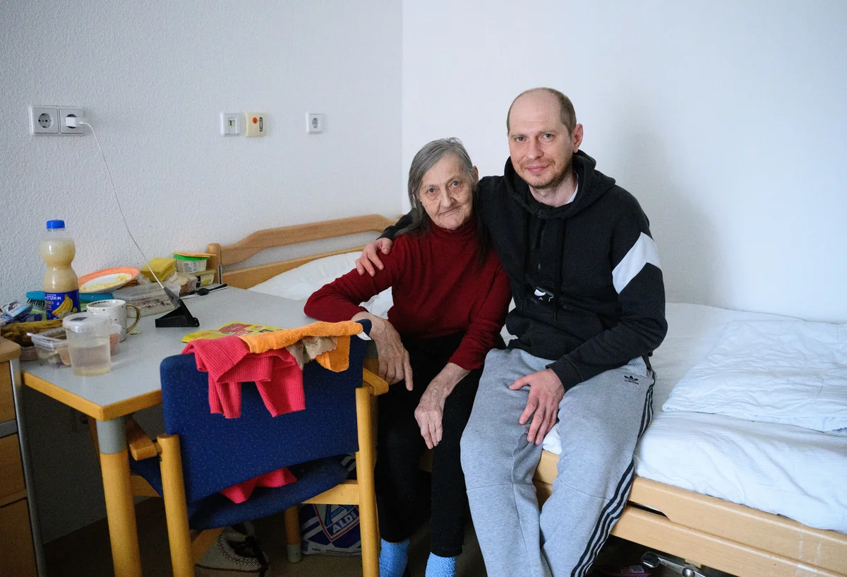 Auch Nataliia Hryhorova lebt im Sunpark, zusammen mit ihrem 36-jährigen Sohn Dmytro. Sie selbst ist 70 und leidet unter anderem an einer Zerebralparese, einem Gehirnschaden. Sie ist von ihrer Krankheit gezeichnet, schaut aber aus wachen Augen neugierig in die Runde. Es gehe ihr gut, sagt sie. Sie habe sogar eine Freundin auf der Etage. Seit September leben Hryhorova und ihr Sohn in der Unterkunft, zuvor mussten sie ein halbes Jahr im Massenlager Tegel ausharren.
