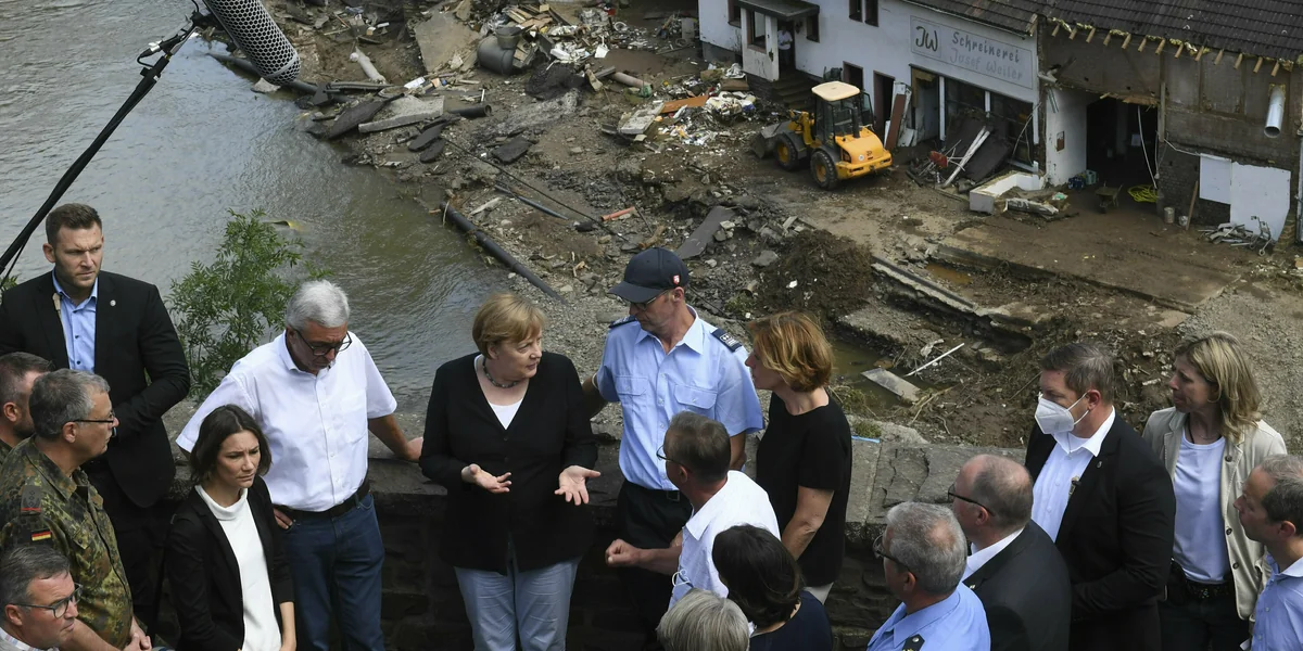 Sie sei gekommen, um sich ein reales Bild von den surrealen, „gespenstischen Bildern“ vor Ort zu verschaffen, sagte Merkel. „Die deutsche Sprache kennt kaum Worte für die Verwüstung, die hier angerichtet ist.“