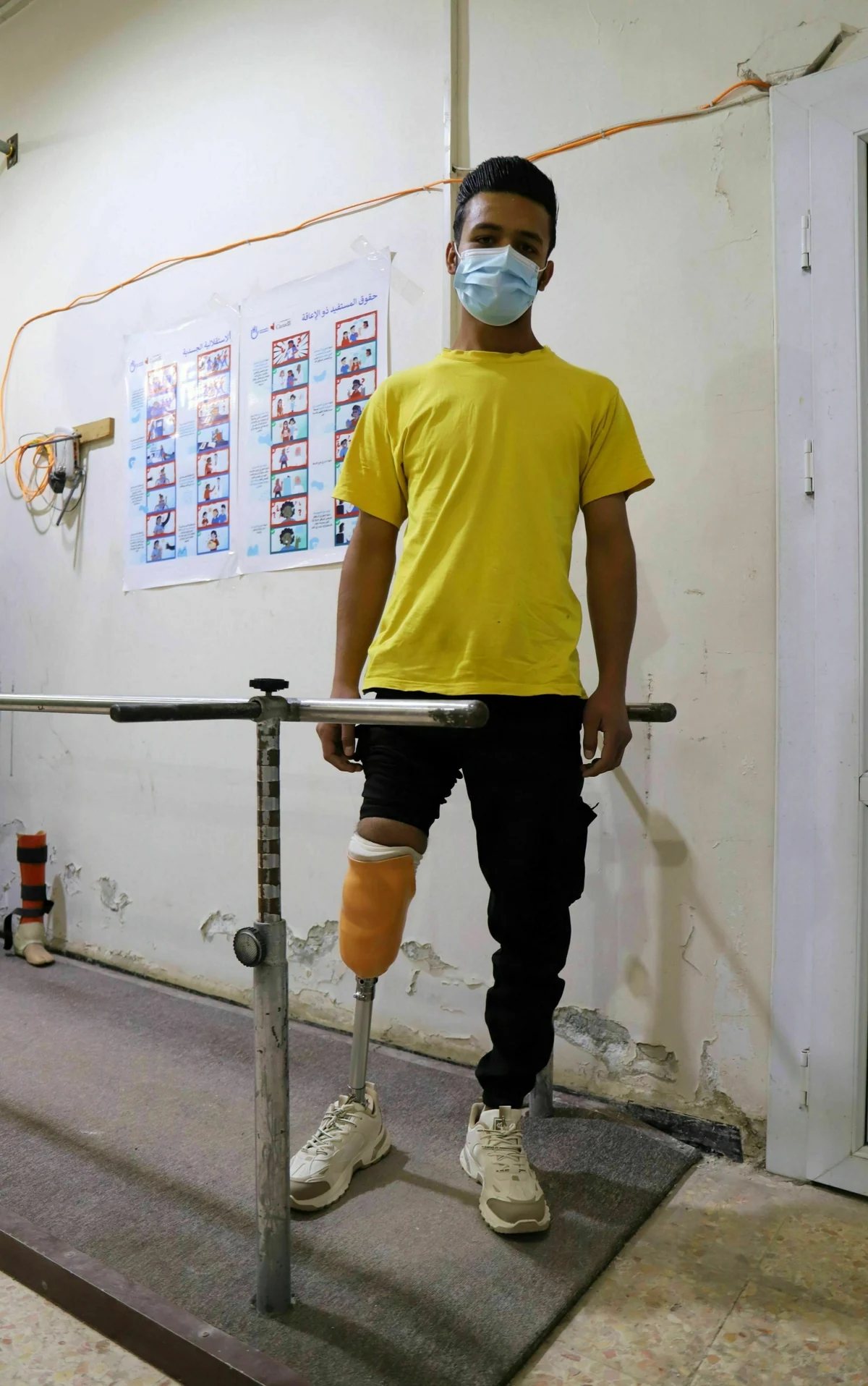 Jemand, der hingegen die 24 Stufen ins Rehazentrum schon hinabsteigen kann, wenn er will, ist Ahmed Haj Khalaf. Khalaf ist heute 18 Jahre alt. Als er zehn war, schlenderte er entlang der Straße. Jemand schrie, daran erinnert er sich noch. Doch er verstand die Worte nicht. Dann explodierte der Boden unter Khalafs Füßen. Unter seinem rechten Fuß, um genauer zu sein.