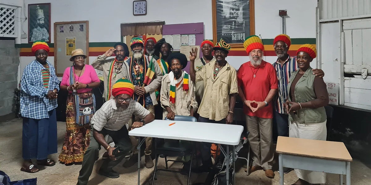 Weder Katholiken noch Anglikaner spielten eine offizielle Rolle bei der Entschuldigungszeremonie der Trevelyans. Aber die Twelve Tribes of Israel, Grenadier:innen, die dem Rastafariglauben anhängen, durften ein paar Gebete sprechen. In St. Paul’s auf einem Hügel nicht weit von der Stadt hat sich eine Gruppe Rastafari im Hauptquartier der „Zwölf Stämme“ versammelt. Ihr Gelände hat einen gepflegten Rasen, eine Freilichtbühne, eine Halle mit Bar und Küche und vielen Bildern, darunter ein von dem äthiopischen Kaiser Haile Selassie, den die Rastas verehren.