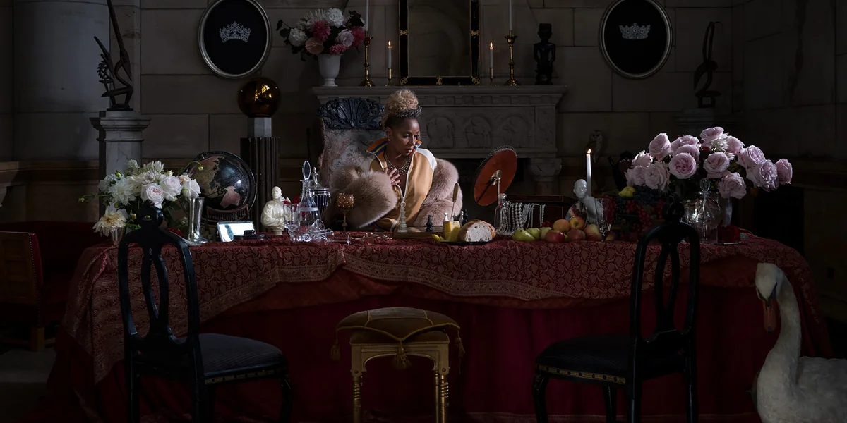 Auch im transatlantischen Sklav:innenhandel erzielte die See- und Handelsmacht im 17. Jahrhundert ihre Gewinne. Dass an dem Tisch eine Schwarze Frau Platz nimmt, noch dazu eine Ikone der HipHop-Kultur, ist ein Bild für die Selbstermächtigung – für die eine in der Musik, für die andere in der Fotografie.