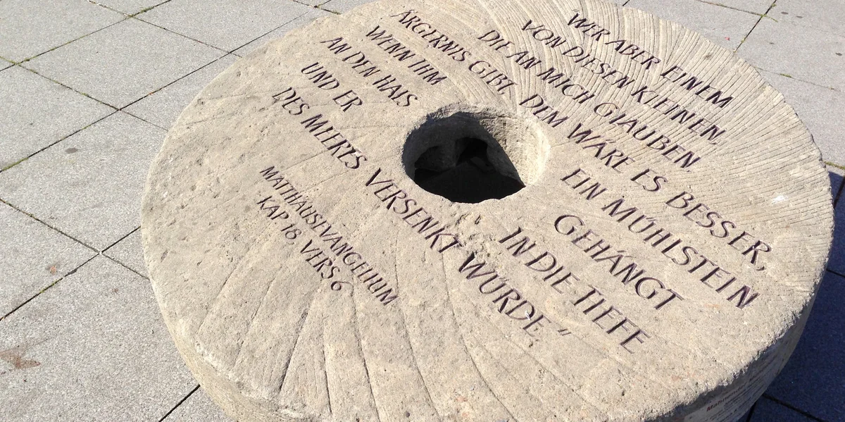 „Wer aber einem von diesen Kleinen, die an mich glauben, Ärgernis gibt, dem wäre es besser, wenn ihm ein Mühlstein an den Hals gehängt und er in die Tiefe des Meeres versenkt würde. Matthäusevangelium, Kap. 18, Vers 6.“