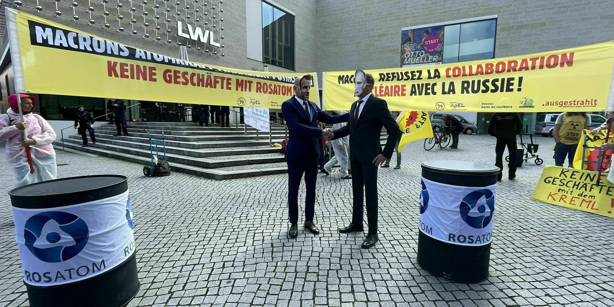 „Macron lässt sich hier als angeblicher Friedenskämpfer feiern. Doch mit seiner Atompolitik finanziert er Putins Angriff auf die Ukraine“, sagt Bettina Ackermann von der Anti-Atom-Organisation „.ausgestrahlt“. Nach den Worten von Wladimir Sliwjak, Co-Vorsitzender der russischen Umweltorganisation Ecodefense und Träger des Alternativen Nobelpreises, ist Rosatom „ein Werkzeug des Kreml“. Das Staatsunternehmen bündele alle nuklearen Aktivitäten des Landes, vom Uranabbau bis zu den Atomwaffen, und sei aktiv am Krieg gegen die Ukraine beteiligt, etwa durch die Besetzung des AKW Saporischschja.