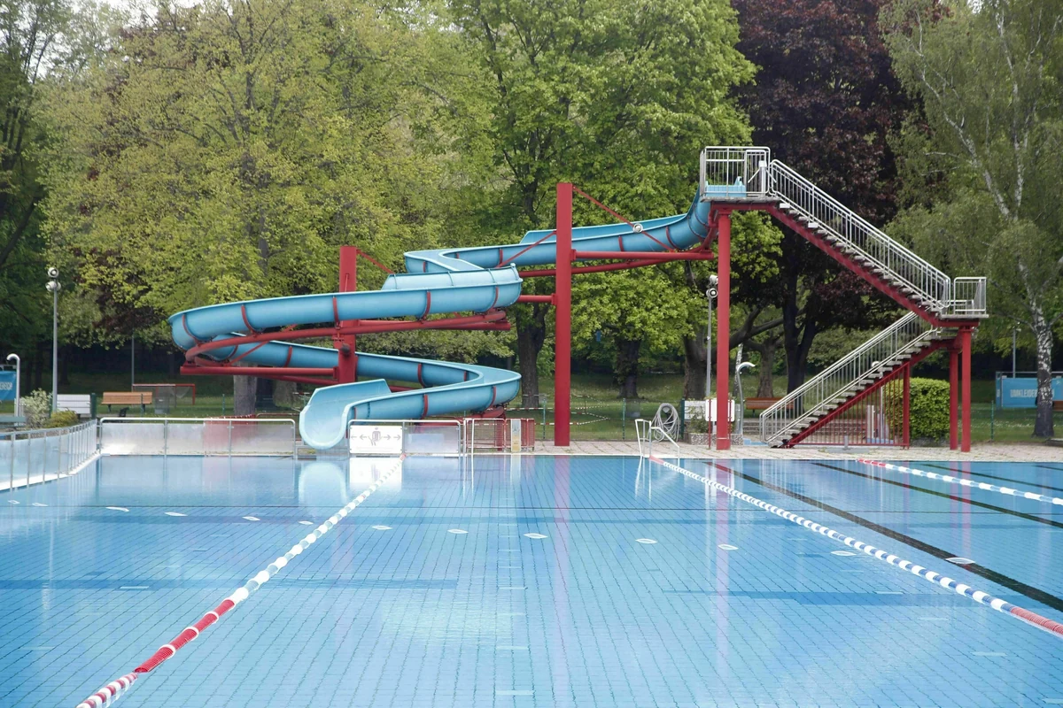 Aber hey, rot-weißes Absperrband sorgt für Ordnung. Auf dem Gelände wachsen in zerbröselnden Betonkübeln ein paar einsame Tagetes. Immerhin wird der Rasen gemäht. Ach ja, und ein Schwimmbad gibt es natürlich auch. Sogar mit einer 50-Meter-Bahn, einer Rutsche und einem Ein-Meter-Sprungbrett.