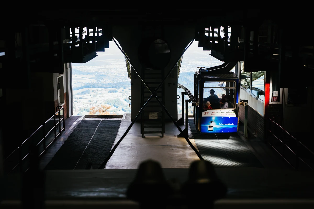 Im Falle vom Schaulinsland geht es nach dem Bus bruchlos weiter, wenige Meter nur sind es bis zur Talstation der Schauinslandbahn auf 473 Metern Höhe. Die Schauinslandbahn ist von 1930, damals war sie auf dem neuesten Stand, die erste Einseilumlaufbahn der Welt mit Ausklinkvorrichtung, in der Talstation hängen alte Fotos.