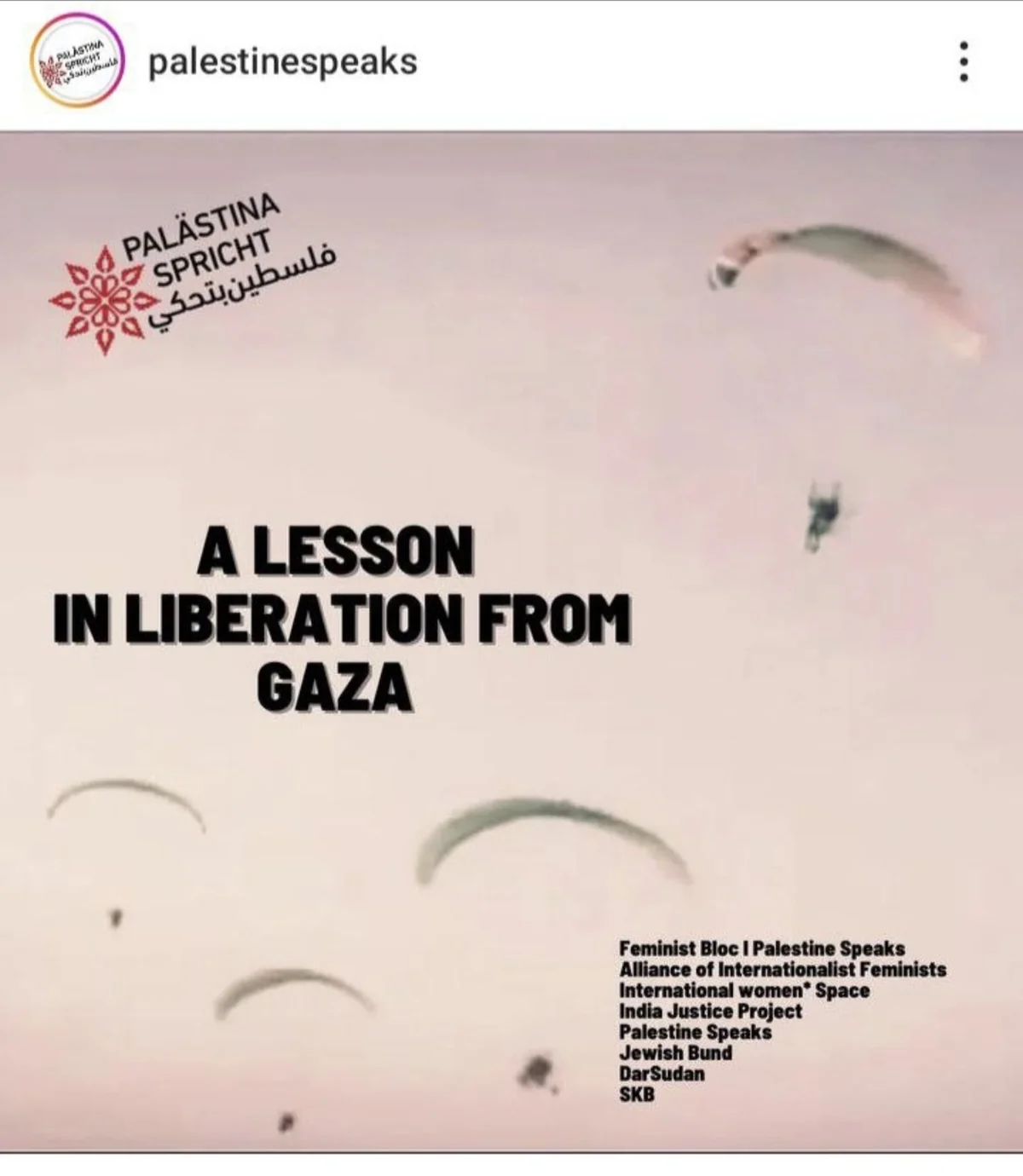 Das Bild trägt den Titel: „A lesson in liberation from Gaza“, mehrere aktivistische Gruppen aus Berlin, darunter unter anderem die feministische Gruppe „Alliance of international feminists“, sind als Unterzeichner*innen aufgeführt. Auf Instagram hat der Post über 2.800 „Gefällt mir“ Angaben.