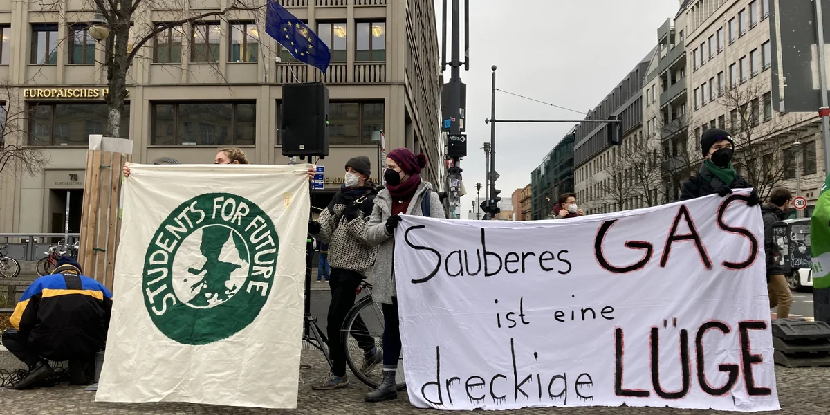 Zwischen Glühweinbude und Currywurststand mit Blick auf die Vertretung der Europäischen Kommission, unweit vom Brandenburger Tor, zeigen sich am Freitagmittag KlimaaktivistInnen. Ort und Zeit sind kein Zufall: Fridays for Future demonstrieren gegen die neue „grüne Taxonomie“ der EU. Die Taxonomie soll private Investitionen mobilisieren und in Tätigkeiten lenken, die notwendig sind, um in den nächsten 30 Jahren Klimaneutralität zu erreichen. Dabei soll für alle Wirtschaftsbereiche festgelegt werden, was nachhaltig ist und was nicht. Dass dabei aber auch Erdgas und Atomkraft ein grünes Label bekommen, sorgt für einen Aufschrei.