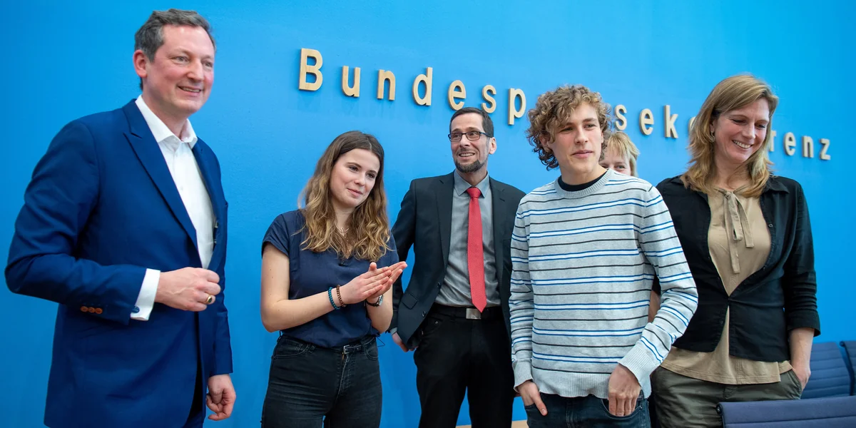Prominente Unterstützung für Luisa Neubauer (2.v.l) und Jakob Blasel (2.v.r.) von Fridays for Future: Eckart von Hirschhausen (links), Volker Quaschning (Mitte) und Maja Göpel (rechts) Foto: dpa