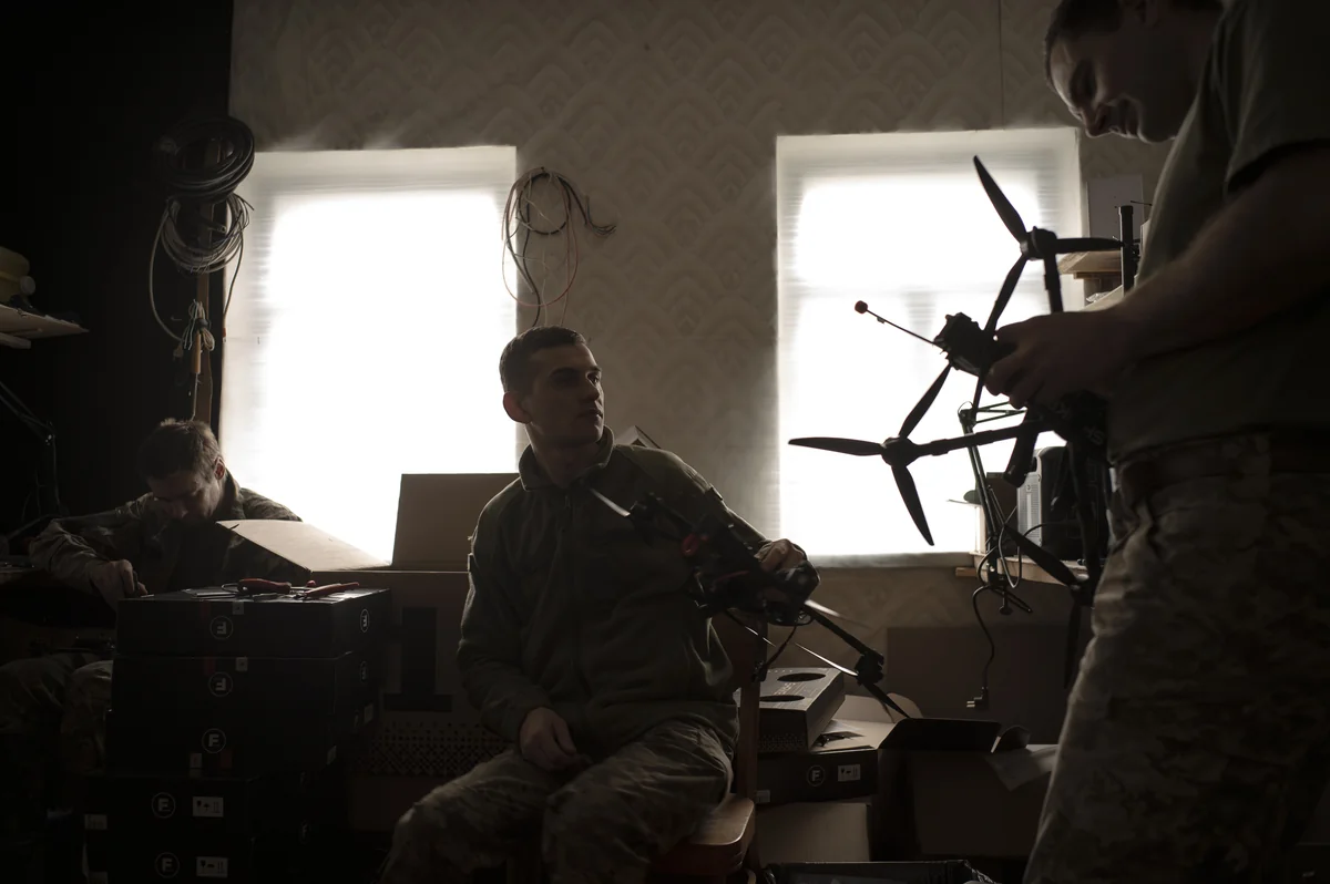 Als sie die Unterkunft des Drohnenentwicklerteams erreichen, zögern Eugeni und Oleksandr keine Sekunde und tauchen in die Dunkelheit ein. Nirgendwo ein Licht, um ihre Position nicht zu verraten. Drinnen schlagen vier Männer die Zeit tot. Drohnen sind aufgrund des Nebels, der die Sicht erschwert, derzeit nicht im Einsatz.