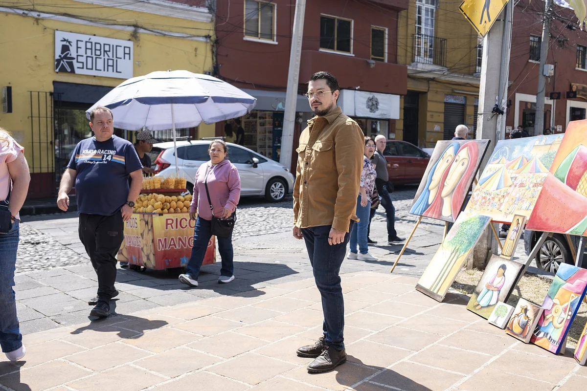 Velázquez trägt Jeans und ein tabakfarbenes Hemd, Gel im Haar. Wenn er fotografiert wird, schaut er durch seine goldene Brille ins Sonnenlicht, ohne zu blinzeln. Er deutet auf die Straße, die nach Osten führt. Eine halbe Stunde zu Fuß in dieser Richtung ist der berühmte Stadtteil Coyoacán mit dem musealisierten Wohnhaus der Künstlerin Frida Kahlo – mittlerweile eine auf Monate ausgebuchte Attraktion in der Stadt.