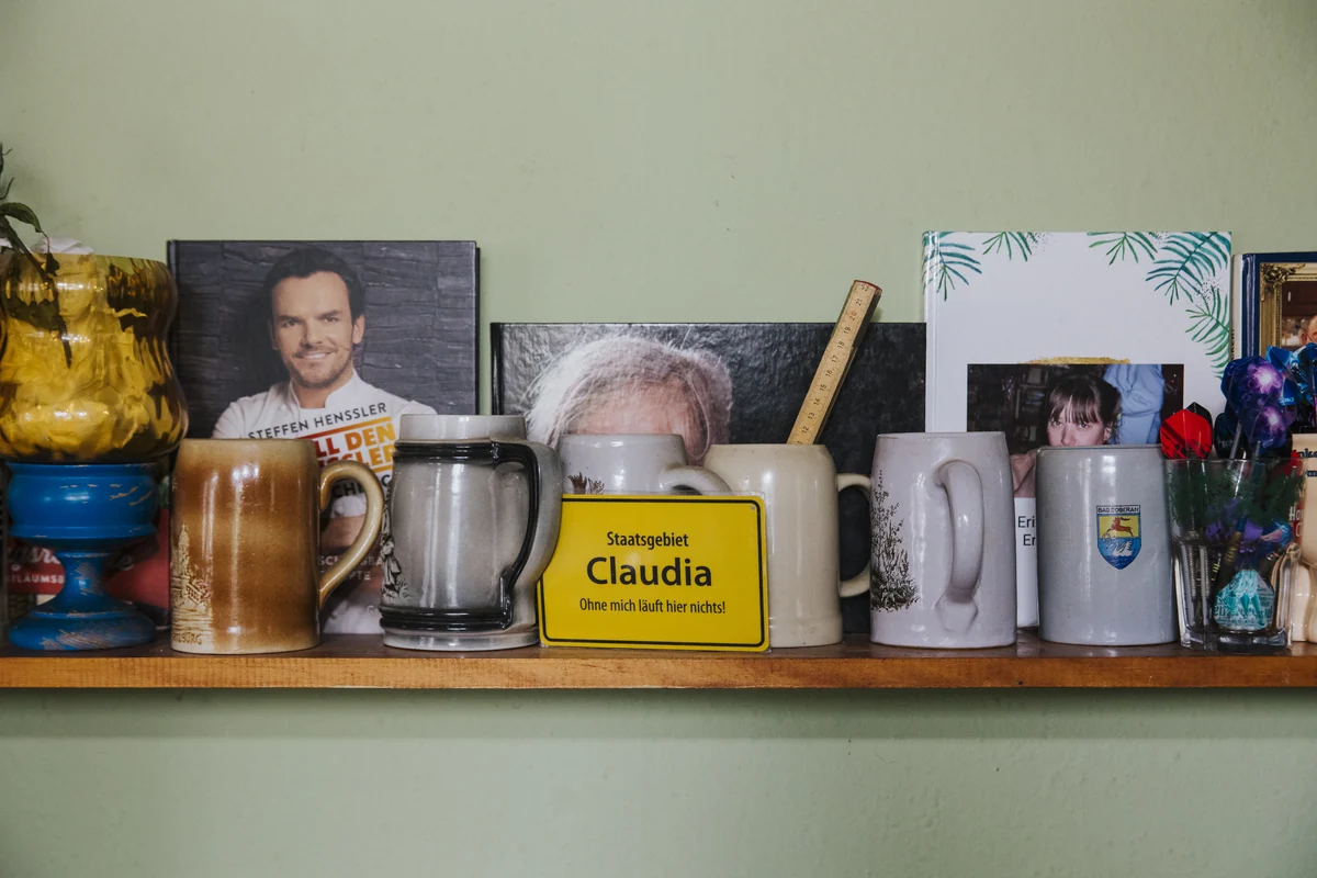 Noch zu DDR-Zeiten, im Jahr 1987, hat Claudia Ehrenhard die Gaststätte in dem ehemaligen Bauernhof von ihrem Vater übernommen. Bereits seit mehr als 120 Jahren gebe hier ein gastronomisches Angebot, sagt sie. Ein bisschen wirkt es, als wäre hier die Zeit stehen geblieben: An den Wänden hängt allerlei DDR-Schnickschnack, die Regale sind vollgepackt mit Pokalen und anderem Krimskrams, die Spitzengardinen, Plüschtiere und Plastikfiguren erinnern an ein altbackenes Wohnzimmer. Lediglich eine alte Dart-Maschine, die Holztische und der Tresen, auf dem sich Kümmerling, Feigling, und andere Liköre stapeln, sowie der Zapfhahn weisen auf eine Kneipe hin. „Staatsgebiet Claudia. Ohne mich läuft hier nichts“, steht auf einem kleinen gelben Schild hinter dem Tresen.
