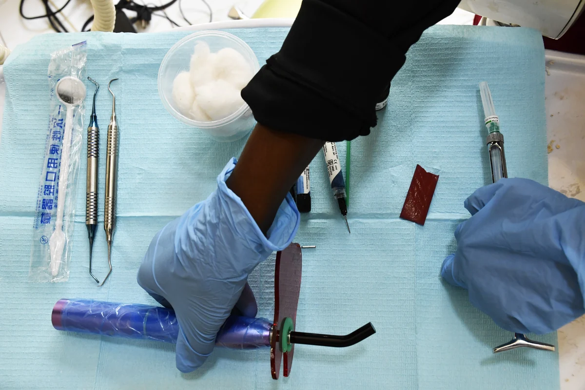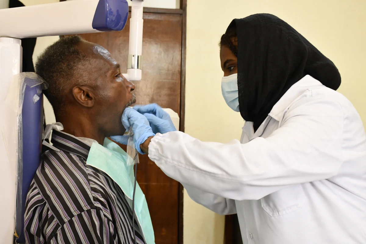 Zahnärztin Shimaa Mahmoud lächelt und deutet ihm mit einer Geste, auf dem Zahnarztstuhl Platz zu nehmen. Während er sich mühsam in den Stuhl hineinzwängt, zieht Mahmoud eine Maske über und dreht an ihrem Computer die Musik lauter. Sanfte sudanesische Klänge mischen sich mit Koran-Suren auf Arabisch. „Meine Patienten haben Angst vor Schmerzen, das soll sie etwas beruhigen“, berichtet die 29-jährige Zahnärztin und streift sich die Plastikhandschuhe über.