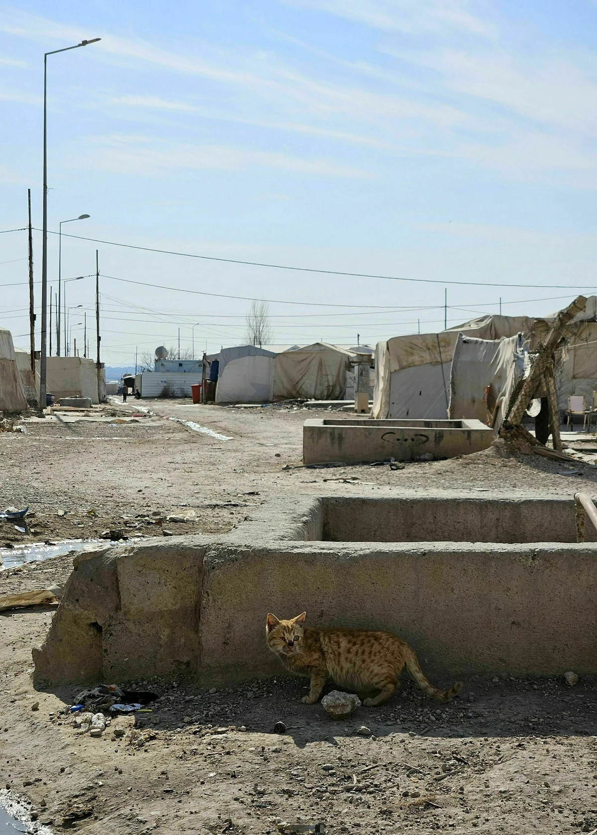 Während Saber Elias in Scharya seine Geschichte erzählt, bringt sein kleiner Bruder Kaffee und Kekse. Seine sieben Geschwister, die Eltern und er teilen sich hier zwei Zelte. Der kleine Weg davor ist betoniert, ein paar Zweige und Äste zwischen den Zeltreihen dienen als Vordach. Die Toiletten und Duschen im Lager befinden sich einige Meter entfernt in verrosteten Metallcontainern. „Es ist alt geworden“, sagt Elias und meint das Lager, das er schon seit 2014 kennt. Und es ist gefährlich: Weil es keine feste Stromversorgung gibt und die Generatoren immer wieder kurzschließen, brechen regelmäßig Feuer aus. Ein paar Nächte ist es erst her, da ist das Zelt einer Familie in der Nähe in Flammen aufgegangen. Nur mit Glück haben alle ohne Brandwunden überlebt.